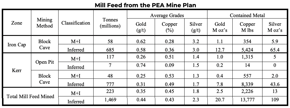 The mining NSR shut-off is C$20 per tonne for the Iron Cap block cave and C$18 per tonne for the Kerr block cave. The mill feed contained in the mine plan for the 2022 PEA including dilution and mining losses are stated as follows.