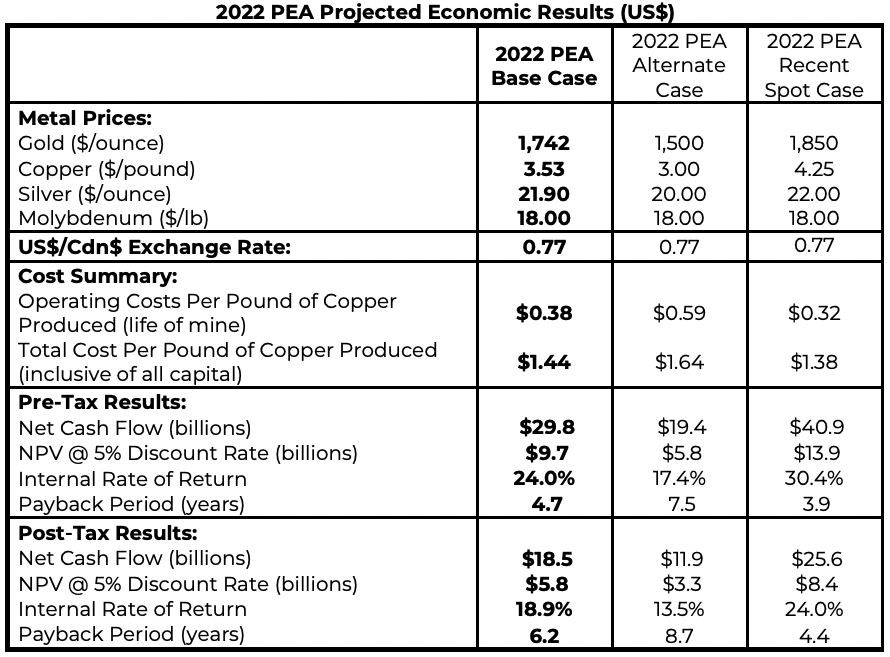 A Base Case economic evaluation was undertaken incorporating historical three-year trailing averages for gold, copper and silver metal prices of as of June 20, 2022. This approach is used because it is consistent with the 2022 PFS Base Case. Molybdenum price is based on a recent study for a primary molybdenum project. Two alternate cases are also presented: (i) an Alternate Case that incorporates lower metal prices than used in the Base Case to demonstrate the project's sensitivity to lower prices; and, (ii) a Recent Spot Case incorporating recent spot prices for gold, copper, silver and the US$/Cdn$ exchange rate. The pre-tax and post-tax estimated economic results in U.S. dollars for all three are as follows: