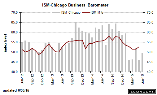 This morning, we got the Chicago ISM data for June. The index covers all sectors of the Chicago economy and it remained 'surprisingly' depressed at 49.4, well below consensus estimates and the fourth month of contraction (sub-50) in the last five months (see chart below). Where is the bounce back the Fed expected from the bad winter weather?
